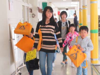 1年生は、ペアの6年生に迎えにきてもらって、うれしくてしかたがない様子です。