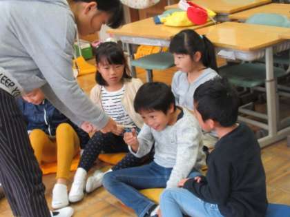 この班は、なんと、にらめっこ。でも、安心してください、お題は、「〇番さんと〇番さんで、指相撲をしてください。」「にらめっこをしてください。」といった、ほのぼのとしたゲームでした。