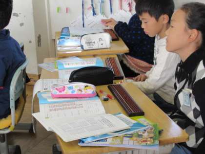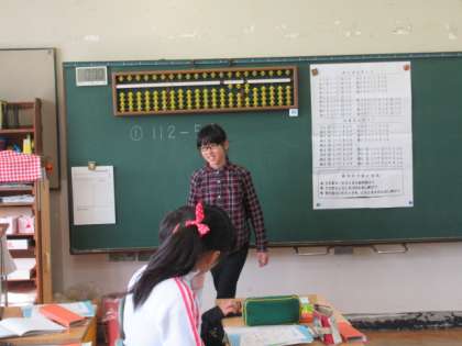 そろばんの学習です。繰り上がりや繰り下がりもある計算で、だいぶ苦戦しています。
