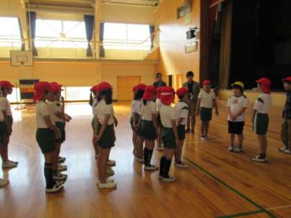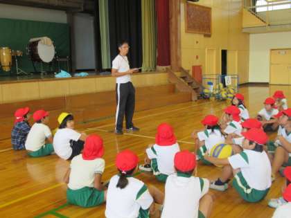 四小校区に居住し特別支援学校に通っているお子さんが、交流に来てくれました。該当学年の4年生との交流です。学期に1回行っており、今日は、4年1組が体育の授業で交流しました。