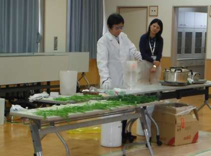 今日は静岡ガスの方をゲストティーチャーに迎え、多目的ホールで行いました。液体窒素の中に風船を入れると、空気が液体となって風船があっという間に縮みます。外に出すと、みるみる膨らんでいきました。この技術を利用して、ガスの体積を小さくして外国から輸入しているそうです。