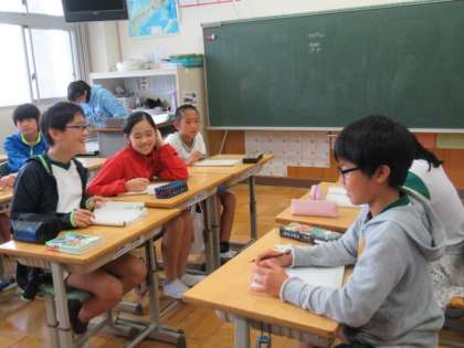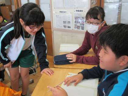 自分のプロフィールを書いていました。自分を見つめ分析しながら書く子あり、友だちとにこやかに話しながら書く子あり。