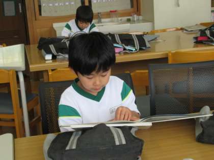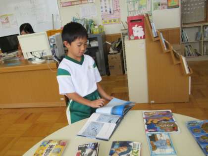 図書室で、読書をしました。目を輝かせて絵本を読んでいました。