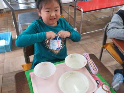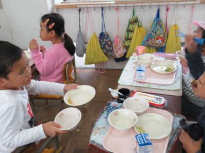 ご飯粒、一つ残らずきれいに食べました。班長さんから、「オッケー!」が出ました。