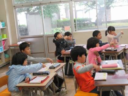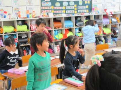 新出漢字の学習です。今日は、「入」「立」の2文字を、形や書き順に気をつけながら書きました。「立」という字では、実際に立ってみて、用法を実感しました。