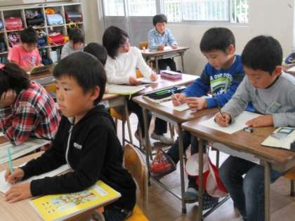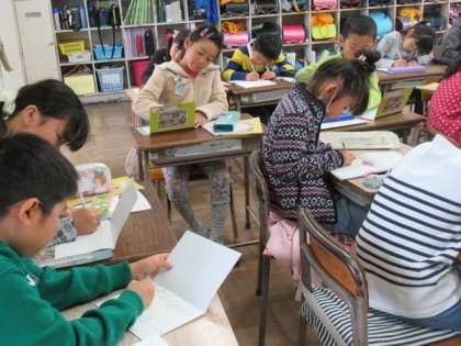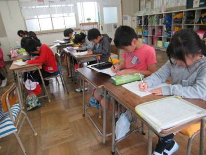 先生が読み上げる予定を、聴き取って書いています。集中して聴く練習にもなります。書いたら、友だちと確認して落ちのないようにしています。