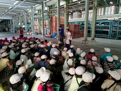 みかん選果場に到着しました。注意事項を聞いて、見学に出発します。