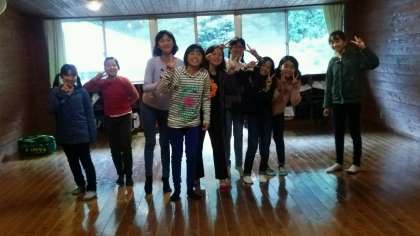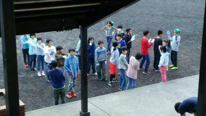 レク係は、キャンプファイヤーの薪を組み立てに、集合しています。