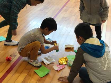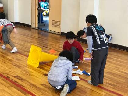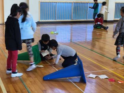1組が学級会で話し合って考えた学年遊びは、「宝探し」。うまくいくか不安でしたが、どの子もあたりくじを探して、体育館の中をあちこち駆け回っていました。