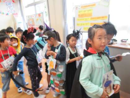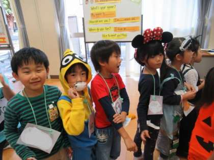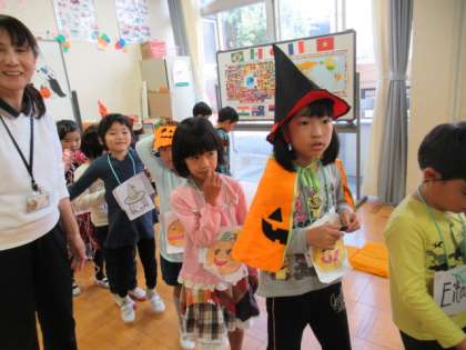 今日は、ハロウィンをテーマにした学習です。仮装をしている子たちもいます。
