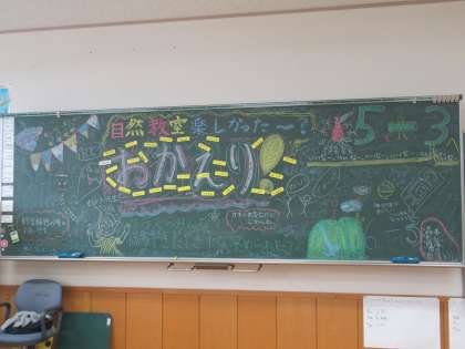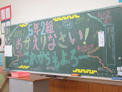 自然教室から帰ってきた5年生の教室。6年生が書いてくれた「おかえりなさい!」のメッセージが、5年生を迎えました。
