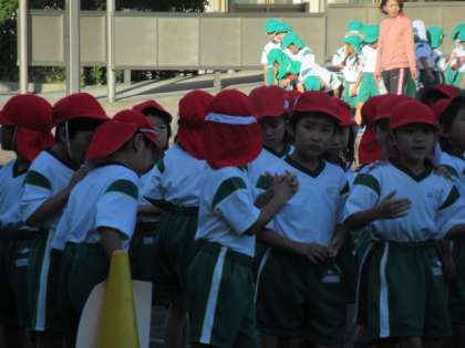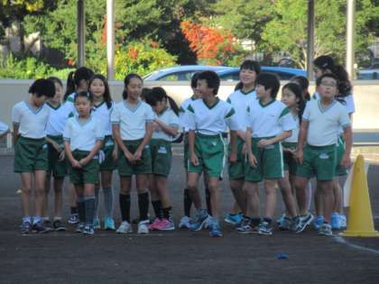 8時〜8時10分は1,2,4年と7組、8時10分〜8時20分は3,5,6年の時間とし、準備運動→5分間走→整理運動という流れで実施しています。