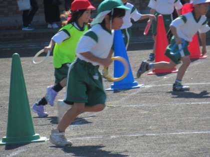 1年生のリレーです。1年生の体育の内容に合わせて、輪をバトンにした折り返しリレーを行いました。