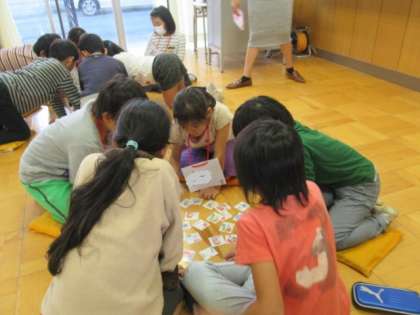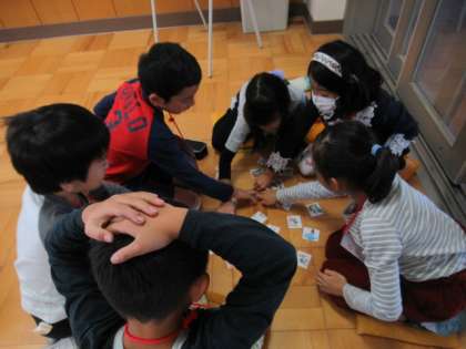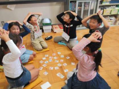 カルタ取りで、英語に親しみます。ALTの先生の発音に、耳を澄ませます。