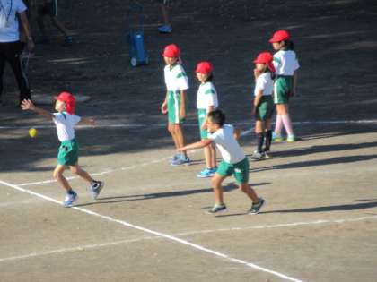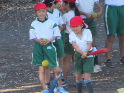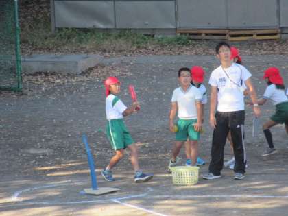 Tボールを楽しんでいます。打ち方、守り方、アドバイスし合いながらゲームをします。