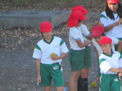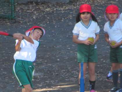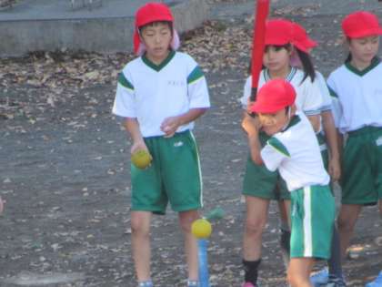 Tボールを楽しんでいます。打ち方、守り方、アドバイスし合いながらゲームをします。
