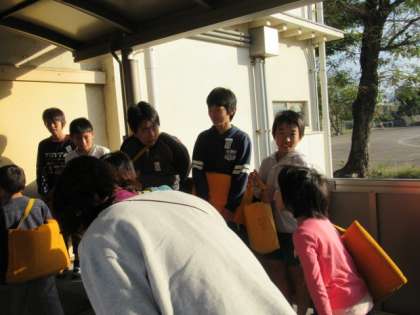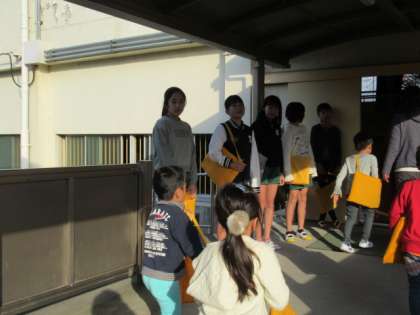 体育館入り口では、計画委員会のみんなが、あいさつで全校児童を迎えました。