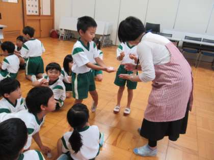 今月は、体重測定と併せて、性に関する指導をしています。1年生は、「からだをきれいに」をテーマに、体を清潔にすることの大切さや方法を学習します。まず、いつものように洗った手を消毒綿で拭いて、綿の汚れから一見きれいに見えても実は手がよごれていることに気づきました。