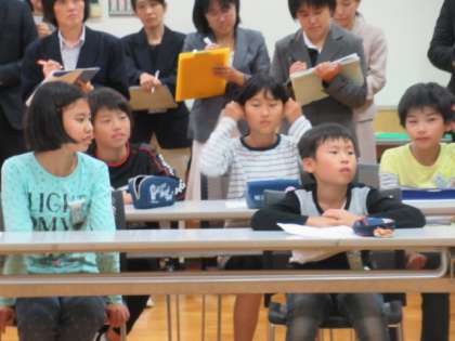 市内各小学校から来てくださったたくさんの参観者に、子どもたちはそわそわ。いよいよ授業が始まります。