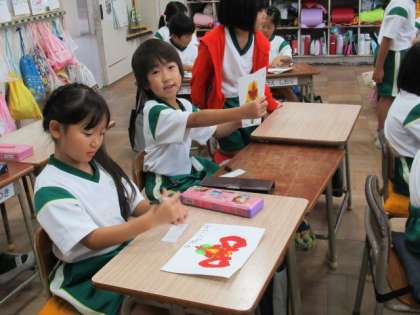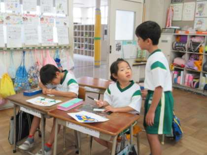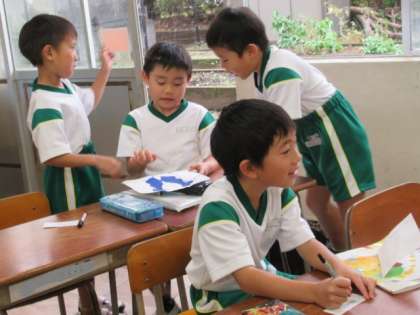 1年生が、コミ祭に出品する作品に名札をつけていました。小さな名札に名前を書くのは、大変そうです。