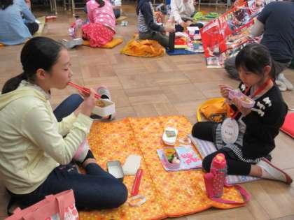 各教室や多目的ホール、体育館などで、班ごとにお弁当をいただきました。