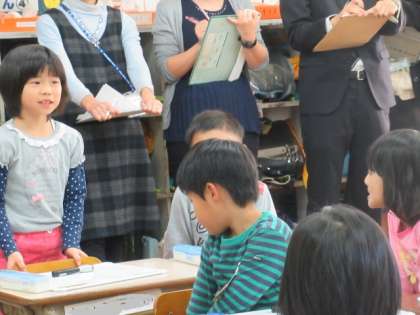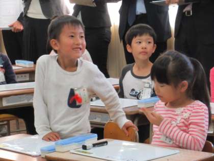 「ひきざん(2)」の学習で、子どもたちは繰り下がりのある引き算に挑戦しました。たくさんの参観者がいてもなんら気にせず、課題に向かって学び合う子どもたちでした。