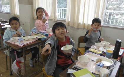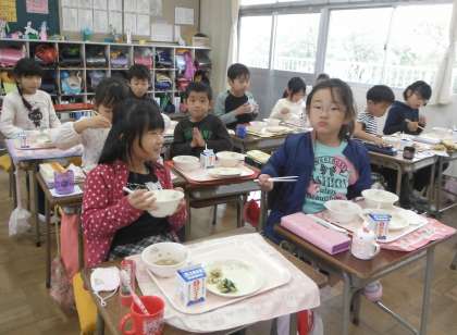 「今日の給食もおいしいよ!」しっかりかんで残さず食べています。