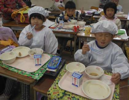 「お魚3匹目」「わたしのおでんにはちくわが3つも入っていたよ。」「前は残していたけれど、今は残さずみんな食べているよ。」1年生はたくさんお話ししてくれます。