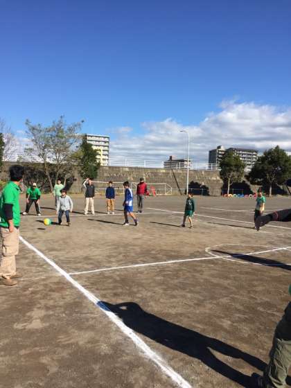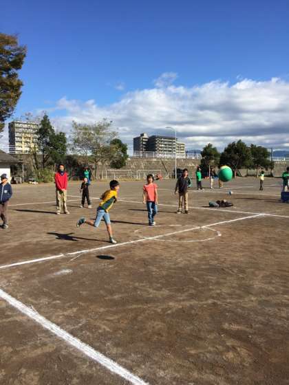 清々しい青空の下、ドッジボールをたのしんでいます。