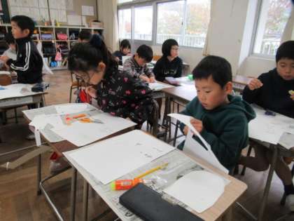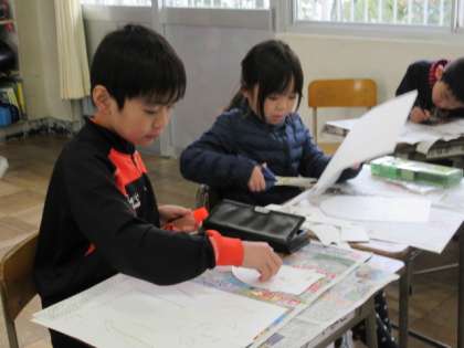 2年生は、紙版画に挑戦しています。画用紙で、顔や体のパーツを作っています。