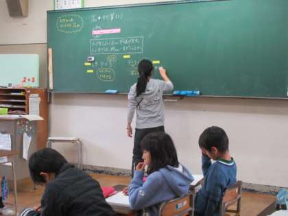 かけ算の学習をしています。「かけられる数」と「かける数」という算数用語を使って、説明をしていました。