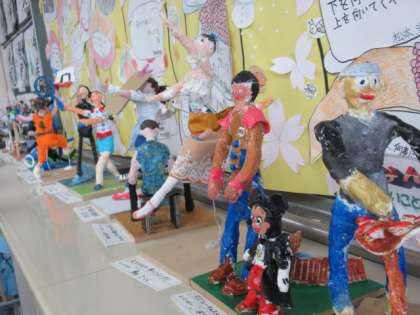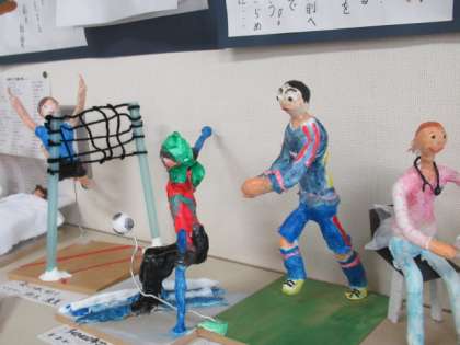 図工の学習で作った「将来の自分の姿(ワイヤーと紙粘土)」が、教室の後ろに飾られています。躍動感がありますね。