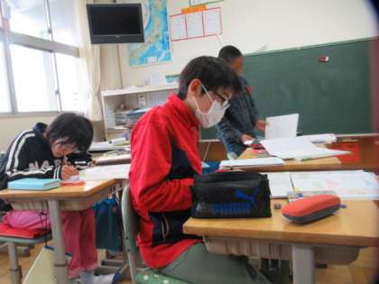 算数の授業でやりきれなかった問題は宿題に。それをさけたいのか、休み時間も頑張っている子たちがいました。さあ、4時間目が始まりますよ。