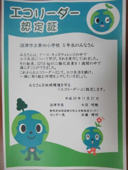 ※ここに載せたのは、学年としていただいた認定証です。子どもたちは個々に、取り組み方に応じて違った文面の認定証をいただきました。