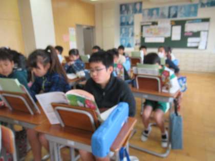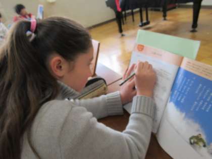 「スキーの歌」の学習が始まりました。まずは、情景を思い浮かべながらCDを聴きました。メモを取りながら聴いている子もいました。
