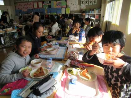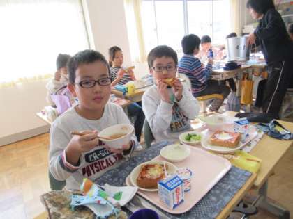 今日は、ピザトーストが出ました。野菜とベーコンを刻み、炒め、トマトソースと和え、1000枚のパンにのせてチーズをかけてオーブンで焼く。こんなに手間をかけて作っていただいた給食です。ありがたくいただきました。