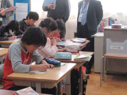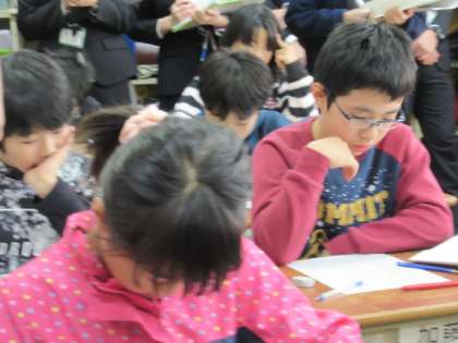 5年生は、ひし形の面積を求める方法を追究しました。まず、個々が考えをもつ段階では、真剣に図形に向き合う姿がありました。