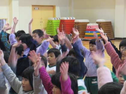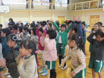 1年生の英語タイムは、歌と踊りが中心です。子どもたちは、楽しみながら、リズムよくテンポよく発音してしていきます。