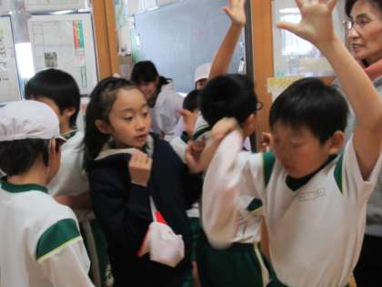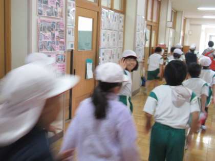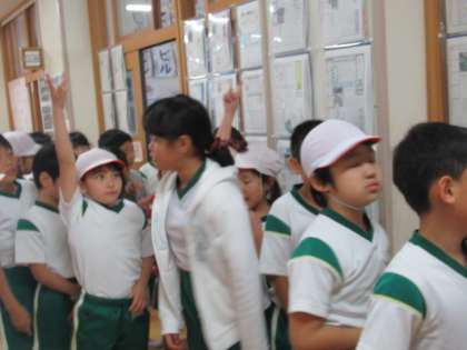 係の子たちが号令をかけて、みんなを並べています。体育館まで上手に行こうね。行ってらっしゃい!