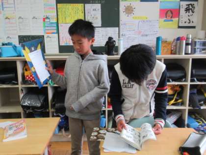 お気に入りの本について、紹介カードを書きました。今日は、互いに読みあって感想を書いていました。