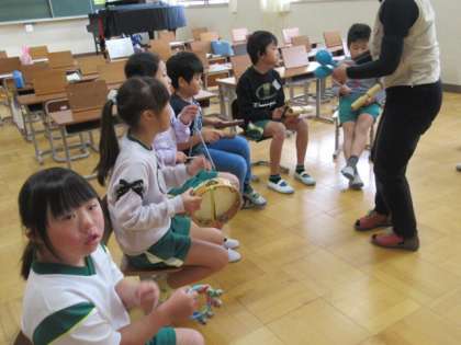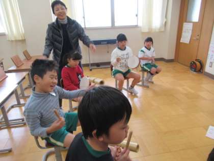 打楽器で、リズム奏をしていました。タイミングが難しいので、成功すると嬉しくて、笑顔です。