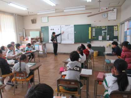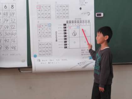 かけ算の学習が進んでいます。みんなに分かるように説明をするのも、大切な学習です。