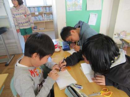 友だちといるだけで、楽しそうです。図工のミニ本づくりを進めている子たちもいました。