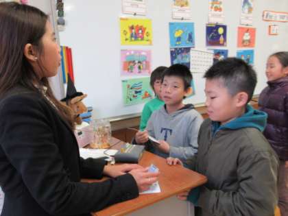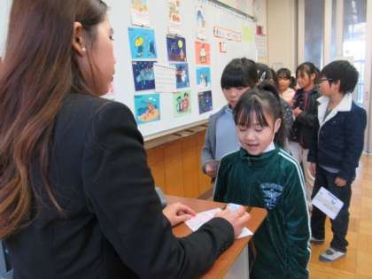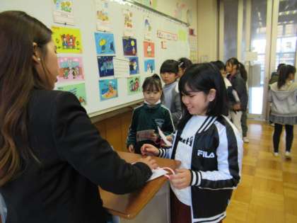 誕生日を聞き合う学習です。友だちと活動した最後に、ALTの先生と会話をしてスタンプを押してもらいます。