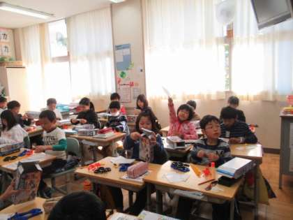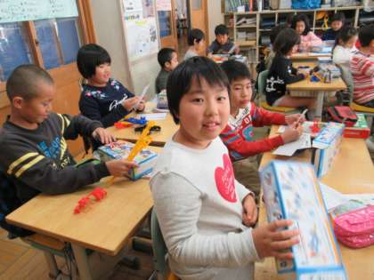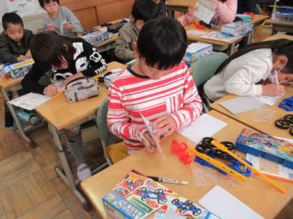 風の力で動く車を作ります。早く走らせたくて、わくわくしています。