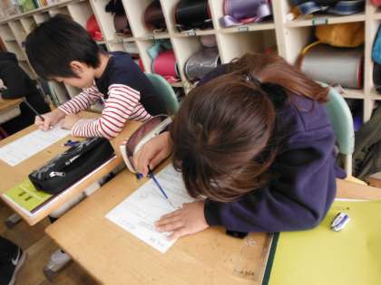 コンパスを使って、2つの直線の長さを比べました。みんな真剣に自分の考えを書いています。