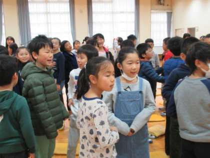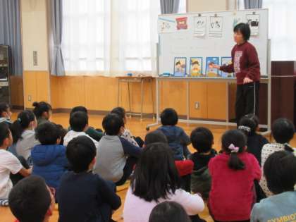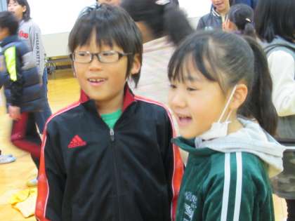 金曜日の朝は、英語タイム。4年生は、多目的ホールで学年合同の英語ゲームをしています。今日は、自分の得意と苦手を友だちに伝える活動でした。