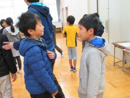 金曜日の朝は、英語タイム。4年生は、多目的ホールで学年合同の英語ゲームをしています。今日は、自分の得意と苦手を友だちに伝える活動でした。