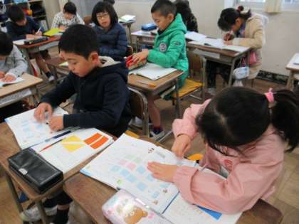 2年生の算数では、分数を学習しています。このクラスは、教科書の図を色で塗り分けていました。