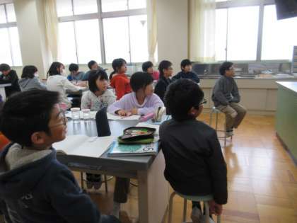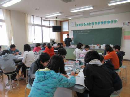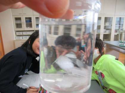 水に溶けたミョウバンと食塩を取り出す実験をします。水温が下がってすでにミョウバンや食塩が姿を現している班もありますが、この班のミョウバンは、大きな結晶になっていてびっくりしました。